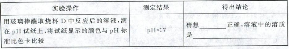 色,证明盐酸与氢氧化钠发生了反应。同学们进一步对烧杯D中反应后的溶液进行探究,对其溶质的成分(除酚酞外)作出如下猜想。