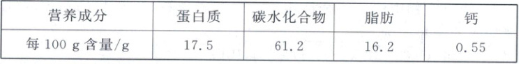 8. 已知1g氮元素大致相当于6.25g蛋白质。通过测定样品中氮元素的含量可以计算出蛋白质的含量。部分测定过程如下:① 样品$ + H_2SO_4 → (NH_4)_2SO_4 + CO_2↑ + SO_2↑ + H_2O;$$② (NH_4)_2SO_4 + 2NaOH = Na_2SO_4 + 2NH_3↑ + 2H_2O。$某品牌奶粉部分营养成分如表所示: