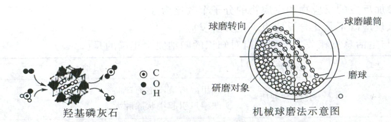 g。(4) 羟基磷灰石可用机械球磨法制备。将$Ca(OH)_2$和$P_2O_5$按照一定比例加入球磨机中,球磨一段时间,发生反应$10Ca(OH)_2 + 3P_2O_5 = 2Ca_5(PO_4)_3OH + 9H_2O。$机械球磨法的工作原理如图所示。