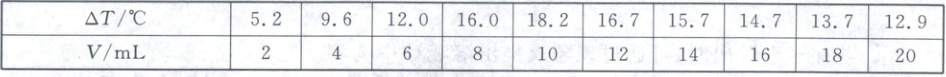 8. 室温下,向一定体积、溶质质量分数为10%的氢氧化钠溶液中滴加溶质质量分数为10%的盐酸,测得溶液温度变化(实时温度与初始温度之差,ΔT)与加入盐酸体积(V)的关系如下。下列表述正确的是(