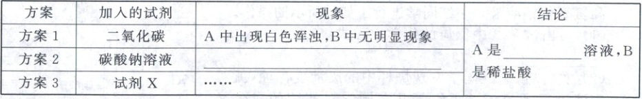 现有两瓶失去标签的无色溶液,其中一瓶是氢氧化钙溶液,另一瓶是稀盐酸。为了鉴别它们,同学们设计了如下实验方案:先给两瓶溶液贴上标签A、B,然后分别取样进行实验。请将横线部分填写完整。