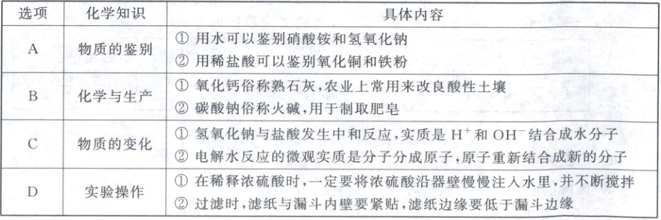 6. 下表对有关化学知识的整理和归纳,错误的是(