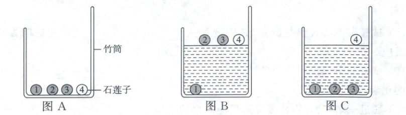 。③ 莲管秤中的1~4号石莲子的密度依次减小。现将两份卤水分别倒入莲管秤中,观察到石莲子的沉浮情况分别如图B和图C所示,对应的卤水浓度较大的是 (