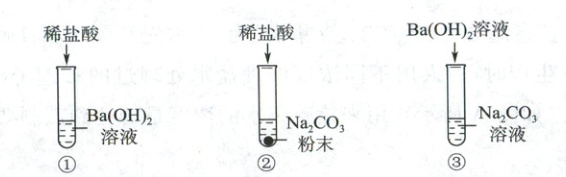 22. 某校化学兴趣小组的同学利用稀盐酸、碳酸钠、$Ba(OH)_2$溶液三种物质探究“复分解反应发生的条件”,做了以下实验。