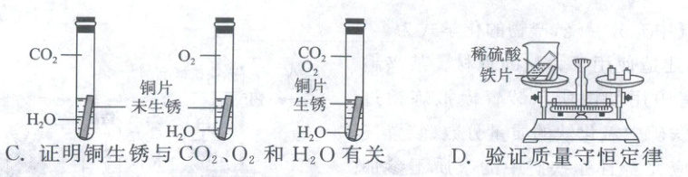 C.证明铜生锈与 $ {CO_{2}} $、$ {O_{2}} $ 和 $ {H_{2}O} $ 有关