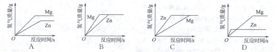 8. 将质量和溶质质量分数均相等的稀硫酸分别与足量的镁、锌两种金属反应,下列图像能正确表示产生氢气质量与反应时间之间关系的是(