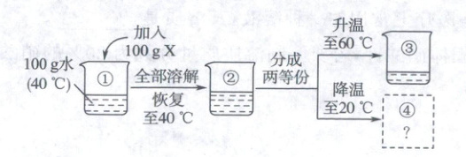 8. 下表是$ KNO_3$和$ NaNO_3$在不同温度下的溶解度,小明用其中一种物质(X)进行了如图所示的实验(水的蒸发忽略不计)。下列分析错误的是(