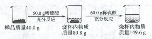 13. 为测定黄铜(铜锌合金)样品中铜的质量分数,小明取一定质量的样品放入烧杯中,分两次加入溶质质量分数相同的稀硫酸,实验过程和数据如图所示。