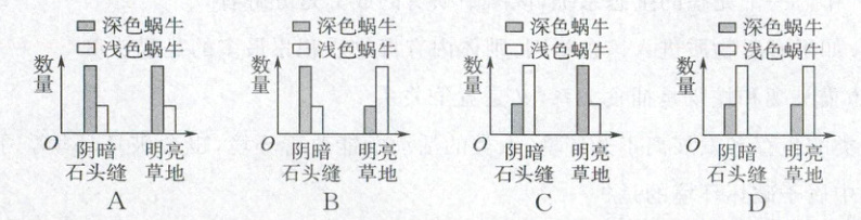 16. 小明同学在野外发现某种蜗牛外壳的颜色有深色和浅色,在阴暗的石缝处或明亮的草地处皆可发现此种蜗牛,且此地区还有一种以此蜗牛为食的天敌。小明同学调查了此种蜗牛在两处的数量后作图,并据此推断出该天敌主要根据视觉效果来捕食蜗牛。下列哪幅图最可能是他的调查结果(C)