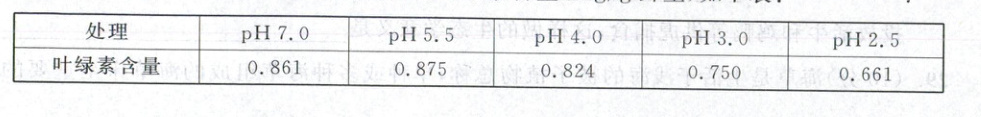 不同pH条件下,处理5天后,灰藓体内叶绿色含量(mg/g鲜重)如下表: