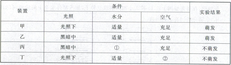(4)探究种子萌发所需的环境条件时,将120粒大小基本一致、自身具备萌发能力的种子平均分成四组,分别放入四套装置中。各装置的设置及实验结果如下表。