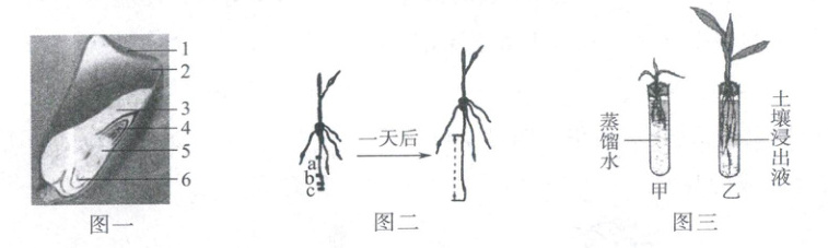 (2)生物小组的同学以玉米的幼根(如图二)为实验材料设计了探究实验:将幼根成熟区以上部分标记为:a区(2cm),成熟区标记为b区(1cm),成熟区以下部分标记为c区(0.5cm),一天后测得该幼根增长了约3cm,此时a、b、c三区的长度依次约为