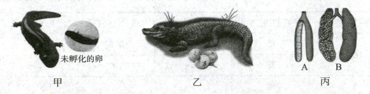 ,这些结构都有利于减少体内水分散失,因而更加适应陆地生活。(3) 图丙中A和B分别为大鲵和扬子鳄的肺结构示意图,观察发现,与A相比,B的肺泡数量