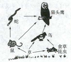 【解析】:A.该食物网中食物链有:草→食草昆虫→鸟→猫头鹰、草→食草昆虫→鸟→蛇→猫头鹰、草→鼠→猫头鹰、草→鼠→蛇→猫头鹰,共4条,A错误;B.图中最高等动物是鼠(哺乳动物),猫头鹰是鸟类,B错误;C.鸟在不同食物链中均为第三营养级(草为第一,食草昆虫为第二),营养级相同,C错误;D.箭头表示捕食关系,非进化关系,D错误。