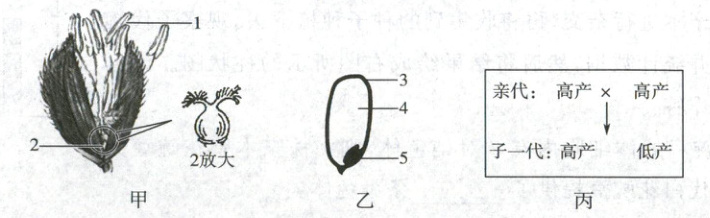 29. (10 分)由袁隆平院士带领科研团队培育的海水稻可以生长在海边滩涂地区,具有抗旱、抗涝、抗病虫害、抗盐碱等特点。图甲、图乙分别表示稻花(两性花)和稻谷的基本结构,图丙为海水稻杂交过程中亲代和子代的性状表现(显性基因用 A 表示,隐性基因用 a 表示)。请回答问题。