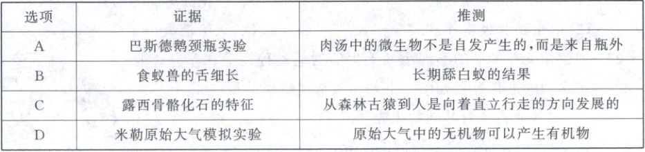 4. 科学推测是根据已有证据通过逻辑思维对未知事物的真相提出的看法。在科学研究过程中,科学家需要运用证据和逻辑做出推测,下列证据与推测之间逻辑关系不成立的是(