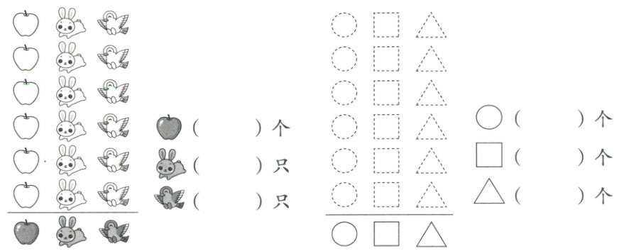 1. 按卡片上事物的种类分一分,涂一涂,填一填。