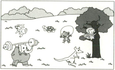 春天来了,森林里真热闹!小动物们在草地上做运动。大象在举重,它的力气真大呀!小兔子在跑步,跑得飞快。小乌龟慢慢地爬着,青蛙在旁边呱呱叫。小猴子坐在树上,开心地吃着桃子。袋鼠蹦蹦跳跳的,好像在和大家打招呼。它们玩得真开心!