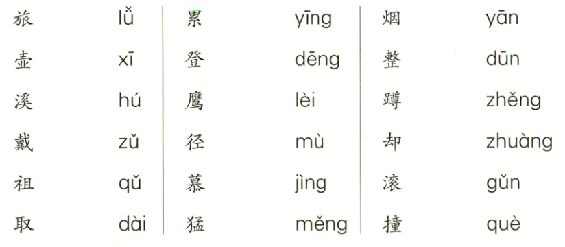 旅 lǚ;壶 hú;溪 xī;戴 dài;祖 zǔ;取 qǔ;累 lèi;登 dēng;鹰 yīng;径 jìng;慕 mù;猛 měng;烟 yān;整 zhěng;蹲 dūn;却 què;滚 gǔn;撞 zhuàng 。
