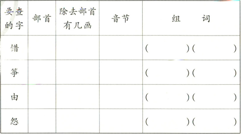 钅、$8$、$cuo$、错误、差错;竹、$6$、$zheng$、风筝、古筝;田、$0$、$you$、由于、理由;心、$5$、$yuan$、怨恨、抱怨。