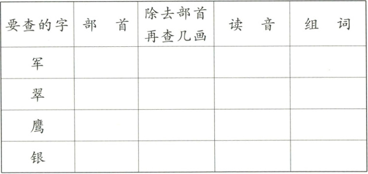 冖 4 jūn 军人 羽 8 cuì 翠绿 广 15 yīng 老鹰 钅 6 yín 银行