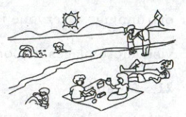 One possible version: It's four o'clock in the afternoon now. It's sunny and hot. Our class are having a class trip on the beach. Look! Some students are swimming in the sea. They are enjoying themselves very much. Two girls are flying a kite. Some of us are lying on the beach to enjoy the sun. A boy is playing with sand on the beach. Two students are having some food and drinks. All of us are having a good time.