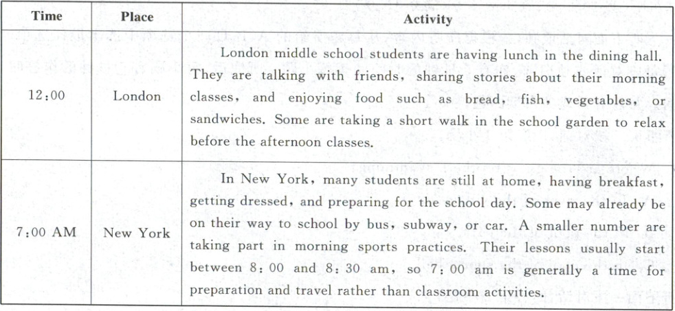 As we know, because of the time difference, different places have different times. For example, it’s 12:00 now in London, but in New York, it’s 7:00 in the morning. Now let’s see what the students are doing at the same time in London and New York.