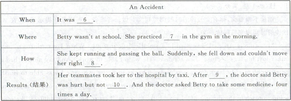 A.6.Sunday 7.basketball 8.hand 9.checking 10.serious B.The speaker tells us about an accident with Betty. It was Sunday. Betty wasn't at school. She practiced basketball in the gym in the morning. She kept running and passing the ball. Suddenly,she fell down. She couldn't move her right hand. Her teammates took her to the hospital by taxi. After checking,the doctor said Betty was hurt but not serious. And the doctor asked Betty to take some pills,four times a day.