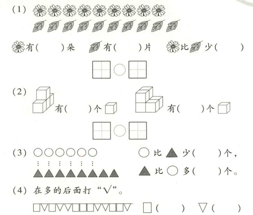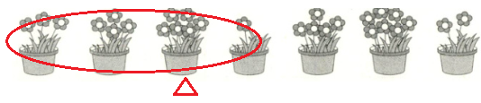 (3)把左边的4盆花圈起来;从右边数,在第5盆花的下面画“△”。