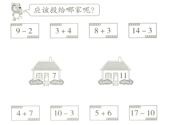 将$9 - 2$、$3 + 4$、$10 - 3$、$17 - 10$与$7$相连;将$8 + 3$、$14 - 3$、$4 + 7$、$5 + 6$与$11$相连(以合理连线形式呈现答案)。