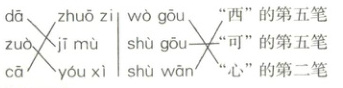 $\begin{array}{c}dā\\zuò\\cā\end{array} $$\begin{array}{c}zhuō zi\\jī mù\\yóu xì\end{array} $ $\begin{array}{c}wò gōu\\shù gōu\\shù wān\end{array} $$\begin{array}{c}“西”的第五笔\\“可”的第五笔\\“心”的第二笔\end{array} $