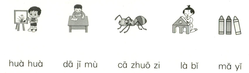 (第一幅图连huà huà,第二幅图连cā zhuō zi,第三幅图连mǎ yǐ,第四幅图连dā jī mù,第五幅图连là bǐ)