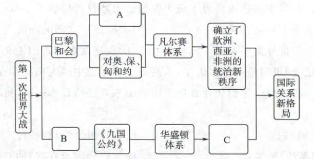 28. (20分)图示法是学习历史的主要方法之一。下面是某同学在学习了凡尔赛—华盛顿体系的相关知识后列出的图示。请你思考并回答下列问题。