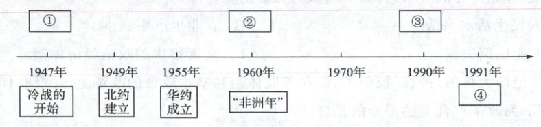 ①丘吉尔的“铁幕演说”标志着冷战的开始 ②20世纪六七十年代,非洲民族独立运动进入到高潮,非洲有17个国家独立 ③纳米比亚独立,标志着所有非洲国家都摆脱了殖民主义的枷锁 ④苏联解体,华约依然存在