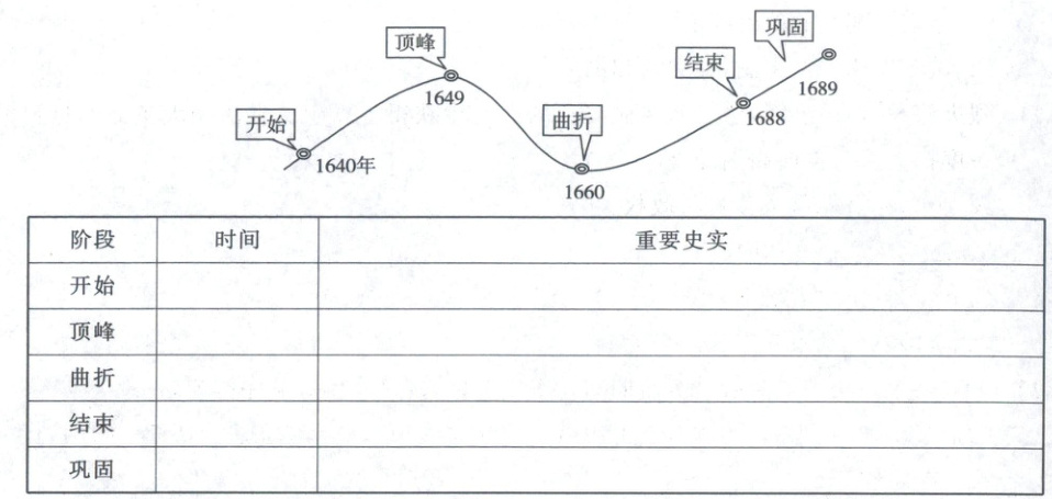 26. (20分)根据英国资产阶级革命示意图,完成下列表格。