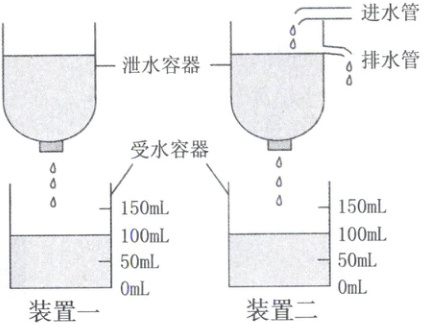 2. 他们利用装置二做同样的实验。受水容器中的水位从 0 毫升到 50 毫升,用时仅为 55 秒,比装置一的少了 5 秒,原因是