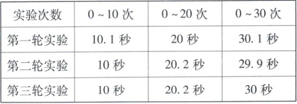 如上图所示,科学探究小组为了探究“同一个单摆,每摆动一次所用的时间是否相同”,设计了一个非常有趣的实验。让摆自由摆动,秒表计时,每摆动10次记录一次摆动时间,共记录3轮。(每摆动10次所需平均时间保留整数)实验记录如下表。