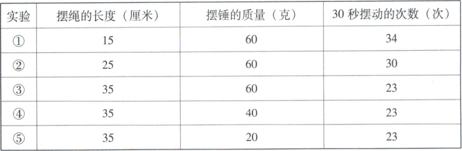 |实验|摆绳的长度(厘米)|摆锤的质量(克)|30秒摆动的次数(次)|