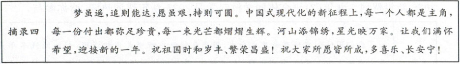 2024 年 12 月 31 日晚 7 时,国家主席习近平通过中央广播电视总台和互联网发表 2025 新年贺词。九年(2)班全体同学掀起学习 2025 新年贺词热潮,请你参与。