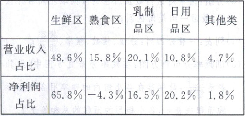 选BC 由题中数据知,营业收入最低的是其他类,A错误;生鲜区的净利润占比65.8%>50%,故B正确;生鲜区的营业利润率为$\frac {65.8\% }{48.6\% }×32.5\% <50\% $,故D错误;同理可计算其他各区的营业利润率,显然日用品区为$\frac {20.2\% }{10.8\% }×32.5\% $,最高,故C正确.