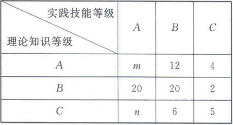 1. 为了进一步提升员工素质,某公司人力部门从本公司2600名一线员工中随机抽取100人,进行理论知识和实践技能两项测试(每项测试结果均分为A,B,C三等),取得各等级的人数如表: