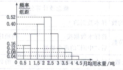 (1)由频率分布直方图知,月均用水量在[0,0.5)中的频率为0.08×0.5 = 0.04,同理,在[0.5,1),[1,2),[2,2.5),[3,3.5),[3.5,4),[4,4.5]中的频率分别为0.08,0.20,0.26,0.06,0.04,0.02.