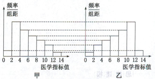 4. 病毒研究所检测甲、乙两组实验小白鼠的某医学指标值,得到样本数据的频率分布直方图(如图所示),则下列结论正确的是 (