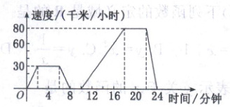 (1)根据某辆汽车的行驶情况记录的函数图象,可得该汽车共行驶了24-2=22分钟;期间的最大速度为80千米/小时;有4个时间点车速为20千米/小时.