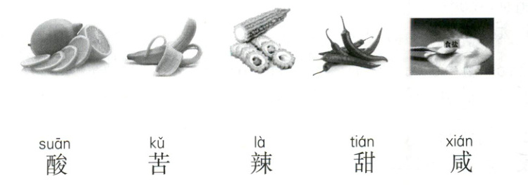 2. 尝味道:柠檬——酸;苦瓜——苦;辣椒——辣;香蕉——甜;食盐——咸 (以连线形式呈现,此处按描述对应)