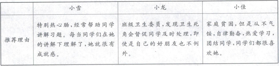 某班开展推荐“班级自尊榜样”班会活动,同学们积极参与,经过自荐、他荐、投票等环节,最终三人高票当选: