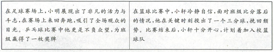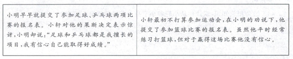 (2)①自信让我们充满激情,小明因自信积极报名并展现非凡活力与斗志;②自信让我们有勇气面对挑战,小轩在比分落后时冷静自信,投出关键三分球;③自信能激发潜能与活力,小明凭借自信赢得奖牌,小轩通过自信体验成功并计划加入校篮球队;④自信有助于我们获得成功,体验快乐,促进自我发展。