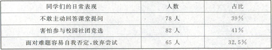 (1) 调查结果反映了本校部分七年级学生存在自信不足的问题,在课堂参与、竞争表现和面对困难时容易出现不敢尝试、自我否定等情况。