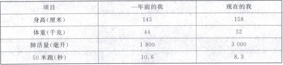 1. 七年级(1)班举办了一场以“青春成长,守护自我”为主题的班会,老师邀请同学们分享自己的成长变化,小南向大家展示了自己的成长记录卡