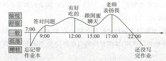 )① 小彤的情绪受多方面因素影响 ② 跟闺蜜聊天使小彤情绪更加愉悦 ③ 小彤因为老师的表扬产生了积极情绪 ④ 小彤这一天的情绪比较稳定